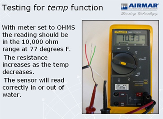 It is very uncommon for an out-of-the-box failure on Airmar transducers, as they undergo strict quality control and product testing before leaving the factory. However, all electronic components will fail over time. You can test your transducer with this simple procedure using a conventional ohm meter (multimeter). This procedure is detailed in the Airmar FAQ, ID #1149: "How can I test the temperature sensor in my transducer?"